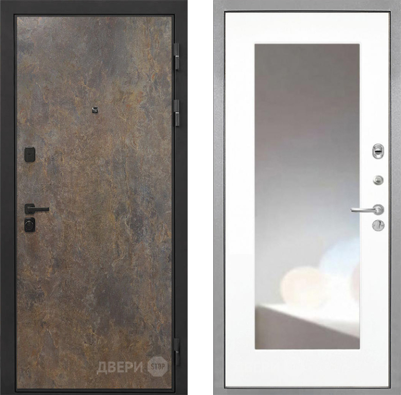 Входная Дверь Интекрон (INTECRON) Профит Black Гранж ФЛЗ-120-М Зеркало Белый матовый 960x2050 мм