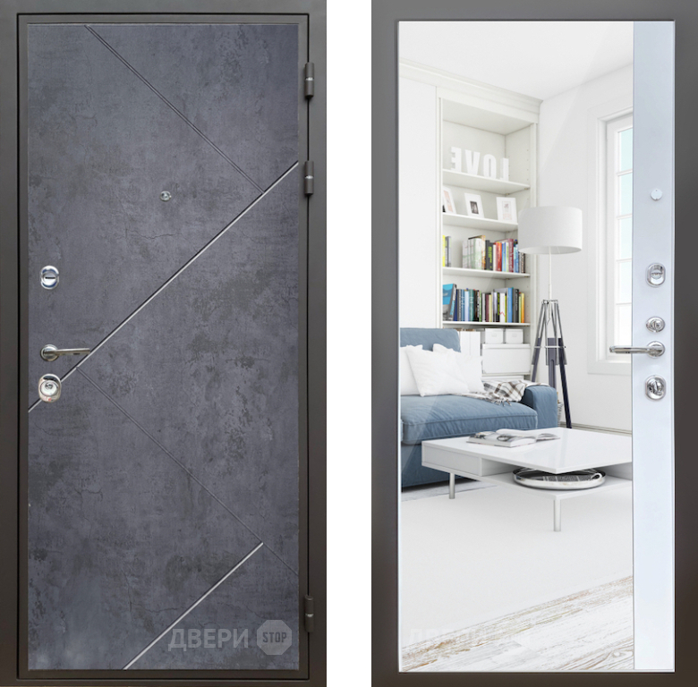 Входная Дверь Шелтер (SHELTER) Комфорт Бетон урбан индиго 14 с зеркалом Белый матовый 860x2050 мм